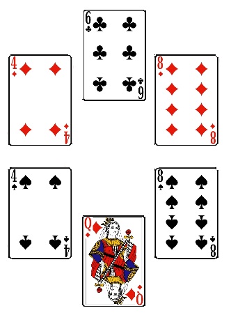 Una vez que miras este flop, no sabes qué diablos es ni por qué las cartas están en esa posición. Al contrario de lo que pudieras creer, no puedes utilizar cualquiera de las cartas para formar tu mejor juego. SIguiendo la lógica del círculo, solo se pueden utilizar tres cartas consecutivas. Los posibles flop son siempre 6. En este caso específico, las posibilidades son: Q-8-8; 8-8-6; 8-6-4; 6-4-4; 4-4-Q y 4-Q-8. No te fijes en el sentido. Da igual si vas en el sentido horario o anti horario.