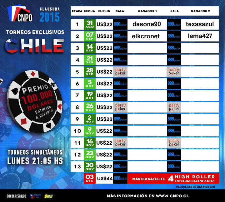 Felicitamos a cada uno de los ganadores y quedan todos invitados a participar de la tercera etapa a disputarse en 888 Poker el lunes 14 de septiembre a las 21:05 horas.