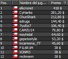 Un total de 76 jugadores se presentaron en el torneo 1 que acumuló un pozo de US$1.520 a repartir entre el TOP 12. Después de 4 horas y 3 minutos de juego, el Campeón fue el jugador “elkcronet“, quien en el mano a mano final vs “CyHanks” se quedó con el primer premio, un hu bastante intenso que pudo ser para cualquiera.