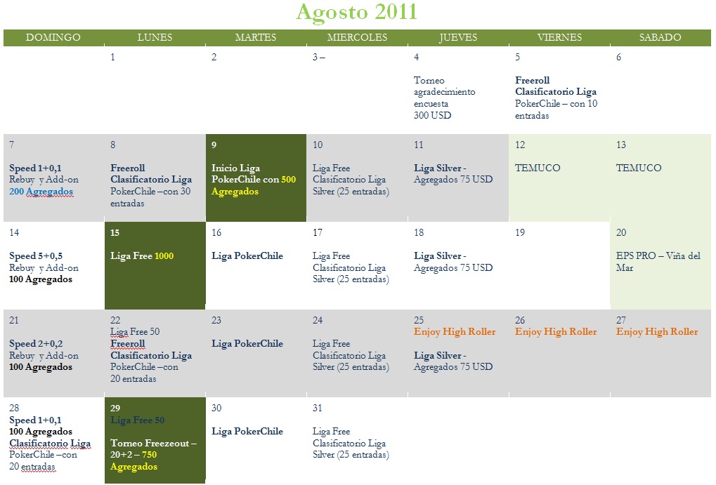 A continuación, tienes el calendario de todos los torneos del mes de agosto en PokerChile: