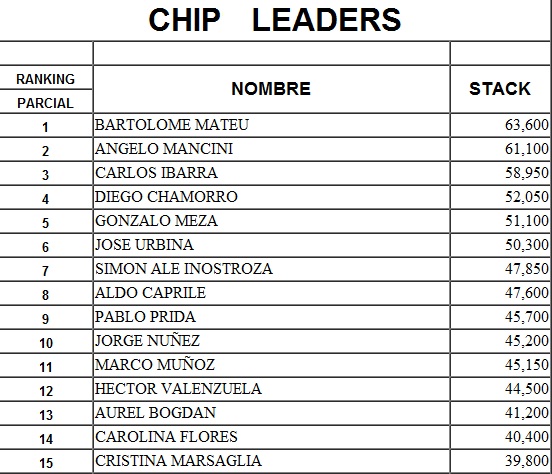 Acaban de subir las ciegas. Hace poco, la organización del torneo organizó un pequeño conteo de fichas y se determinó quienes son los chip leaders hasta el momento. Esta esla lista oficial de Enjoy: