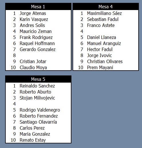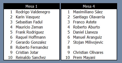 Nos encontramos con 26 jugadores aún en juego en momentos en que las ciegas están a 4.500.000/9.000.000. El promedio de fichas es de 166 milones por jugador. Así están conformadas las mesas en estos minutos: