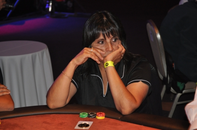 María González, quien logró pasar casi todo el torneo short stack, es la nueva eliminada en el 13° lugar. En un all-in preflop contra Robinson Tapia, María aceptó con