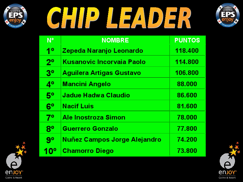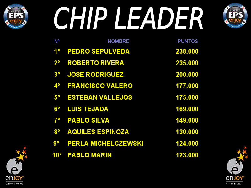 Volvemos del break y tenemos una lista oficial de Enjoy sobre los chip leaders (aunque Jorge Núñez dice ser el chip leader, con más de 260 mil). Ahora empieza el torneo “de verdad”, mientras que al otro lado del salón comienza el Second Chance, donde vemos de vuelta muchos de los jugadores que nos dejaron durante la jornada de hoy.