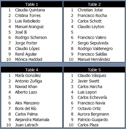 Los jugadores que pasaron al sabado y la distribucion de las mesas es la siguiente: